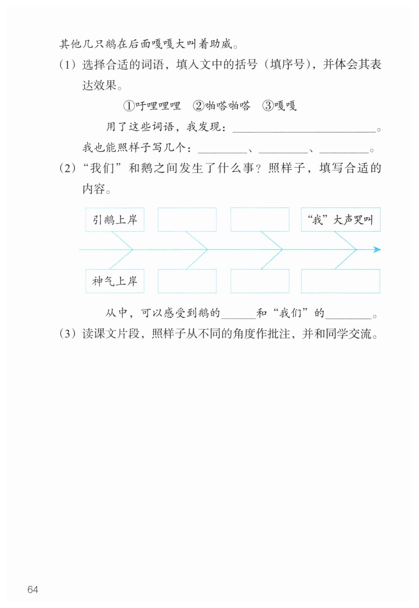 ②鵝聽(tīng)見(jiàn)了,就豎起頭來(lái),側(cè)著眼睛看了看,竟爬到岸上,