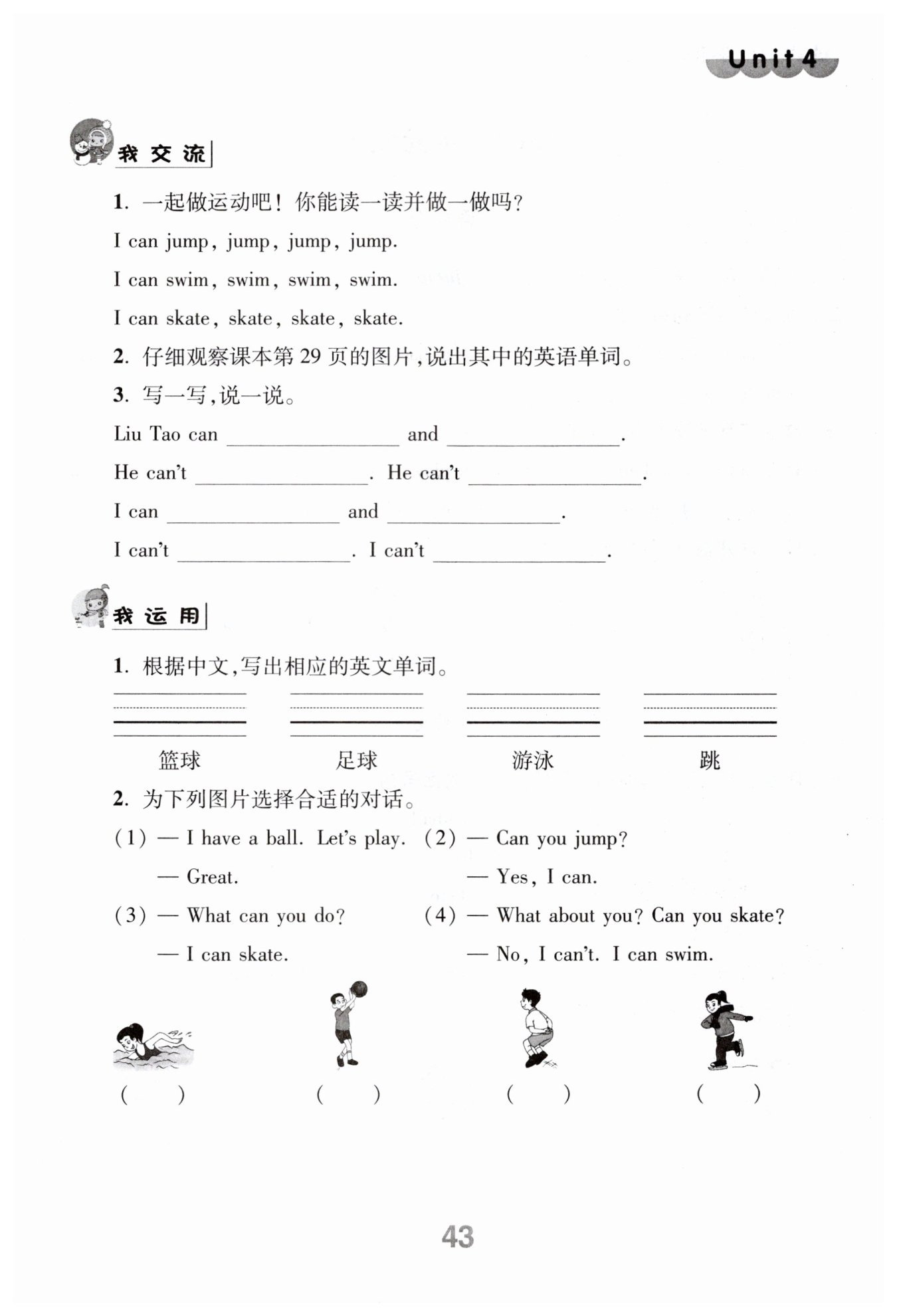 2. swim, play basketball, play table tennis, skate