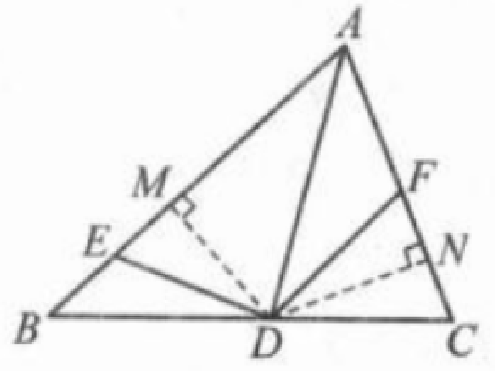 證明 ∶ 如圖,過點?$D$?作?$D M⊥A B $?,?$ D N⊥A C$?,垂足分別為?$ M $?、?$ N$?