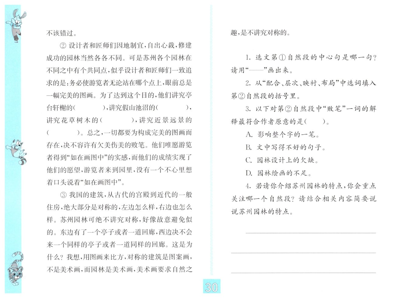 重點(diǎn)讀第③自然段。蘇州園林不講究對(duì)稱(chēng),
