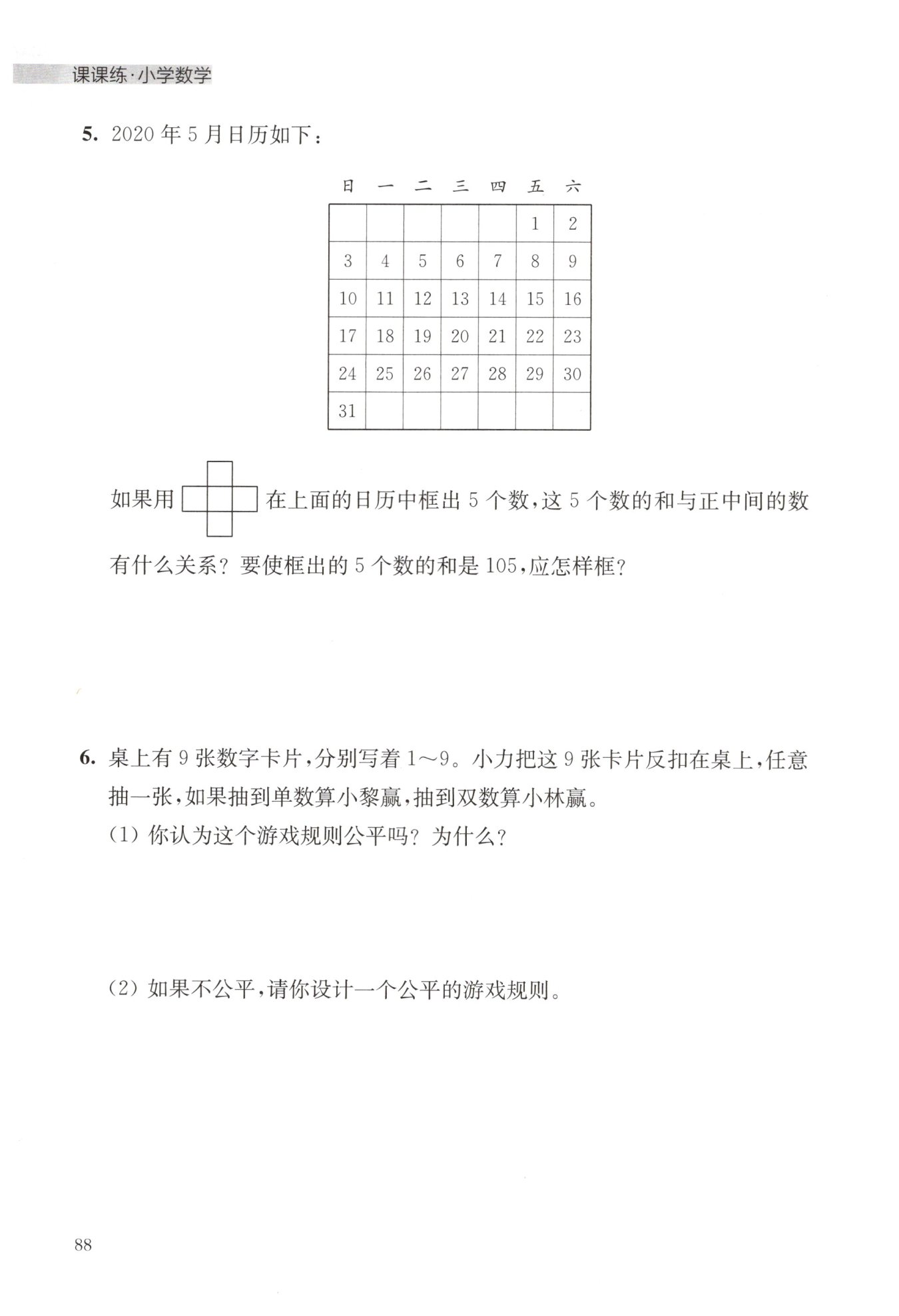 答:這5個數(shù)的和是正中間的數(shù)的5倍。要使框出的5個數(shù)的和是105 ,應(yīng)該以21為正中