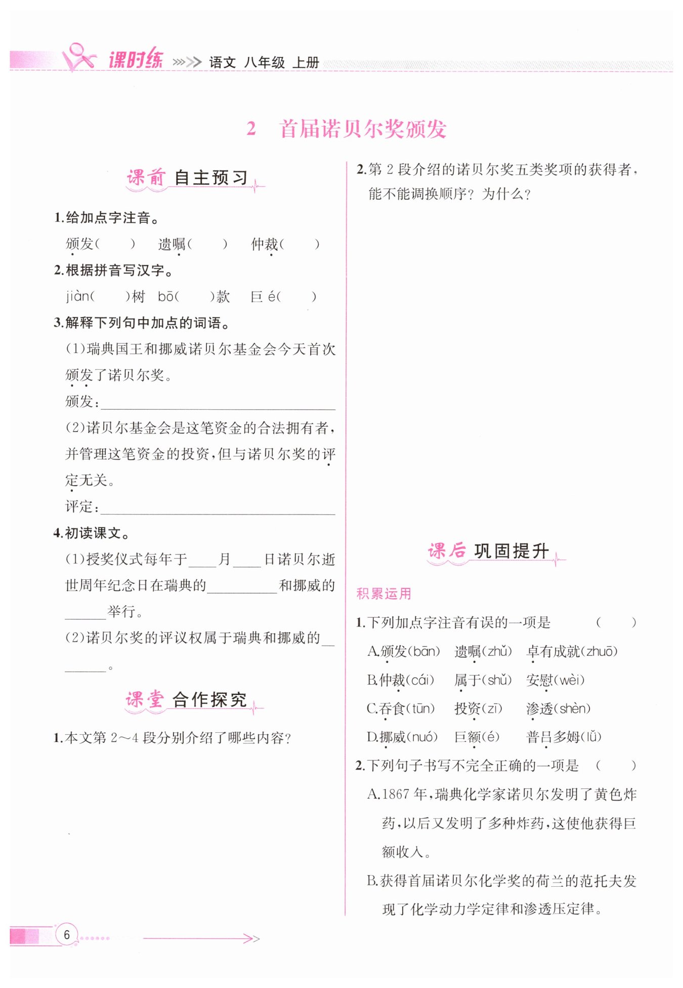 上文諾貝爾的遺囑相照應(yīng),所以不能調(diào)換。