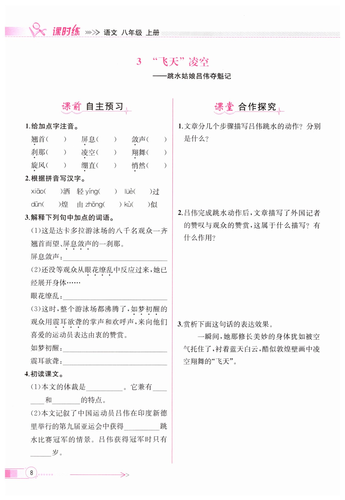 側(cè)面描寫(xiě)。襯托了呂偉跳水動(dòng)作的優(yōu)美