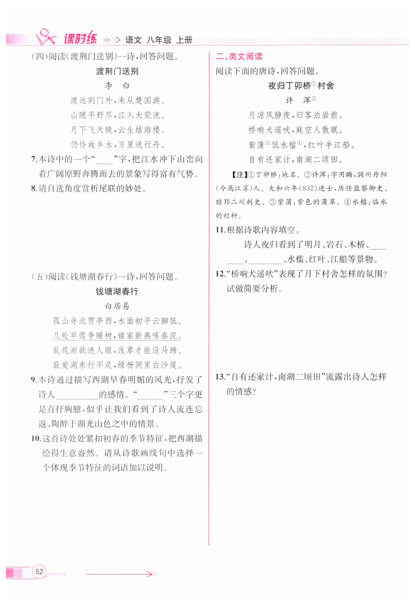 示例二:尾聯(lián)運(yùn)用擬人的修辭手法,賦予故鄉(xiāng)水以人的情感,含蓄地抒發(fā)了詩人的思鄉(xiāng)之情。