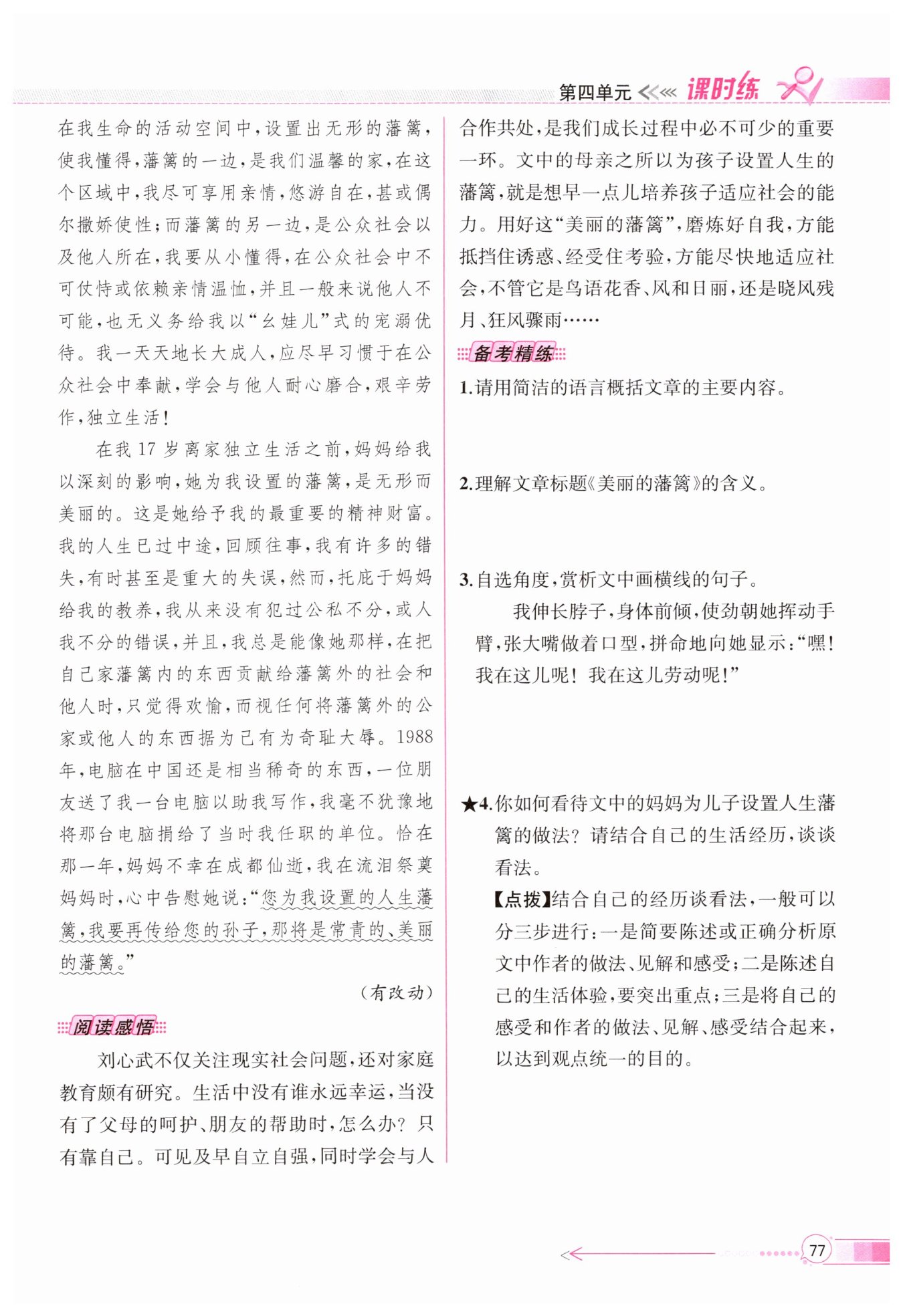 運用了比喻的修辭手法,“藩籬”在文中喻指“無形的界限”。界限一邊是溫馨的家,我們可以享受親情,偶爾撒嬌;界限的另一邊是公眾社會及他人,我們要習慣奉獻,學會合作,艱辛勞作,獨立生活。媽媽教給“我”這個正確而深刻的道理,令“我”受益終身,所以稱之為“美麗的藩籬”。