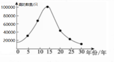 第15年鹿的數(shù)量達(dá)最高值。第30年鹿的數(shù)量為最低值。