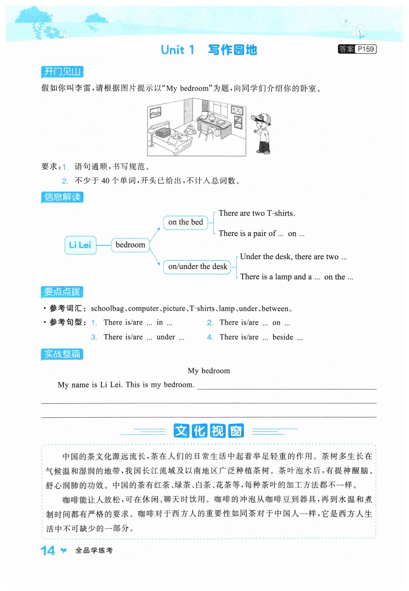 It's small, but it's nice. On the bed, there are two T-shirts and a pair of socks. There is a schoolbag between the bed and the desk. I like playing with balls, so there are two balls under the desk. There is a computer and a lamp on the desk. Beside the lamp, there are two books. On the wall, there are some pictures, and they're very beautiful. I like my bedroom very much.