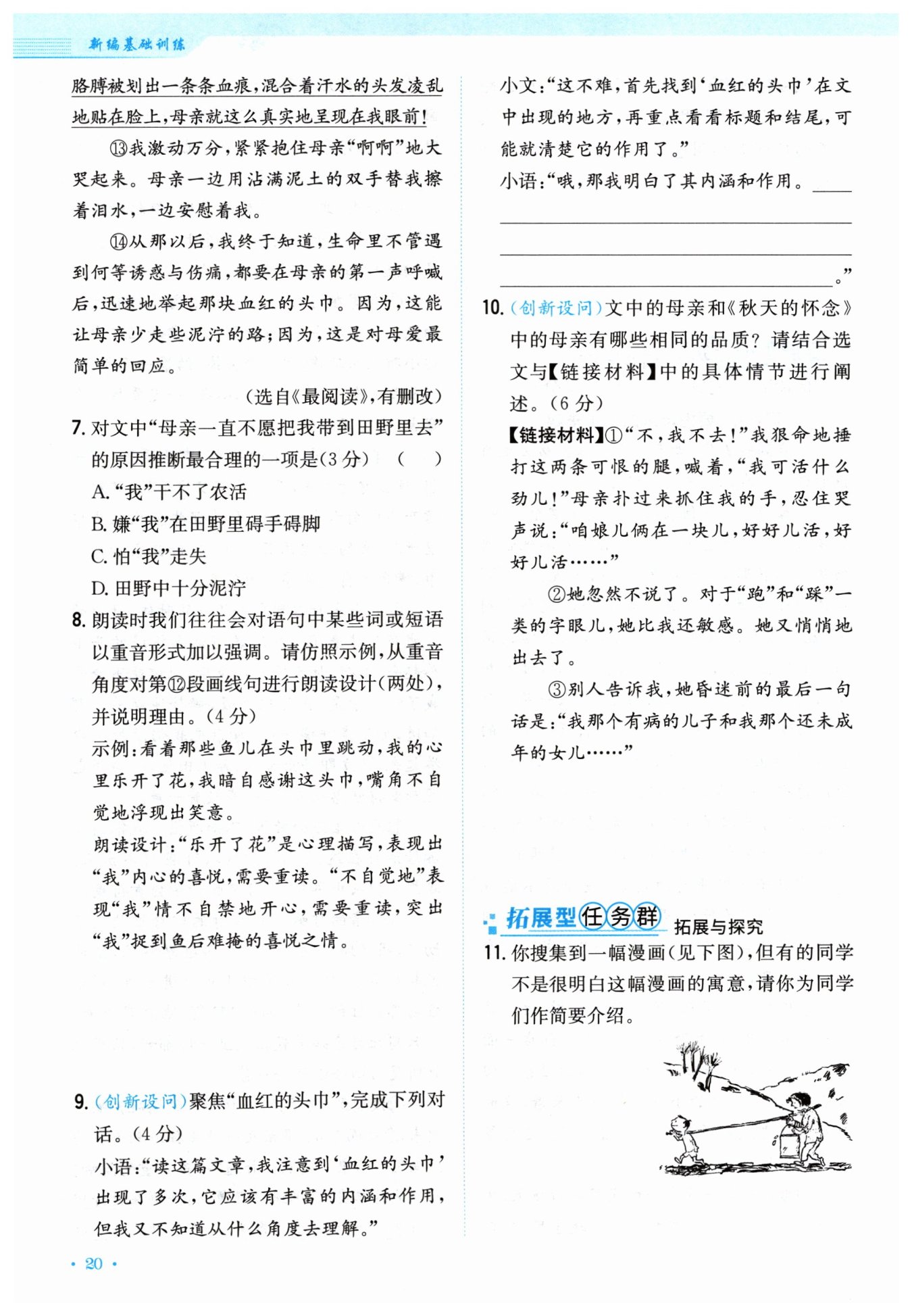 (示例)①堅(jiān)強(qiáng):本文的母親坦然接受“我”不能說(shuō)話(huà)的事實(shí),【鏈接材料】中如“咱娘兒倆在一塊兒,好好兒活,好好兒活·····.”。②細(xì)心:本文的母親叮囑“我”聽(tīng)到呼喊后舉起頭巾,【鏈接材料】中如“對(duì)于“跑'和“踩'一類(lèi)的字眼兒,她比我還敏感”。③愛(ài)子心切:本文的母親為了給“我”治病宰了牲畜請(qǐng)客“沖喜”,【鏈接材料】中如“我那個(gè)有病的兒子和我那個(gè)還未成年的女兒……”
