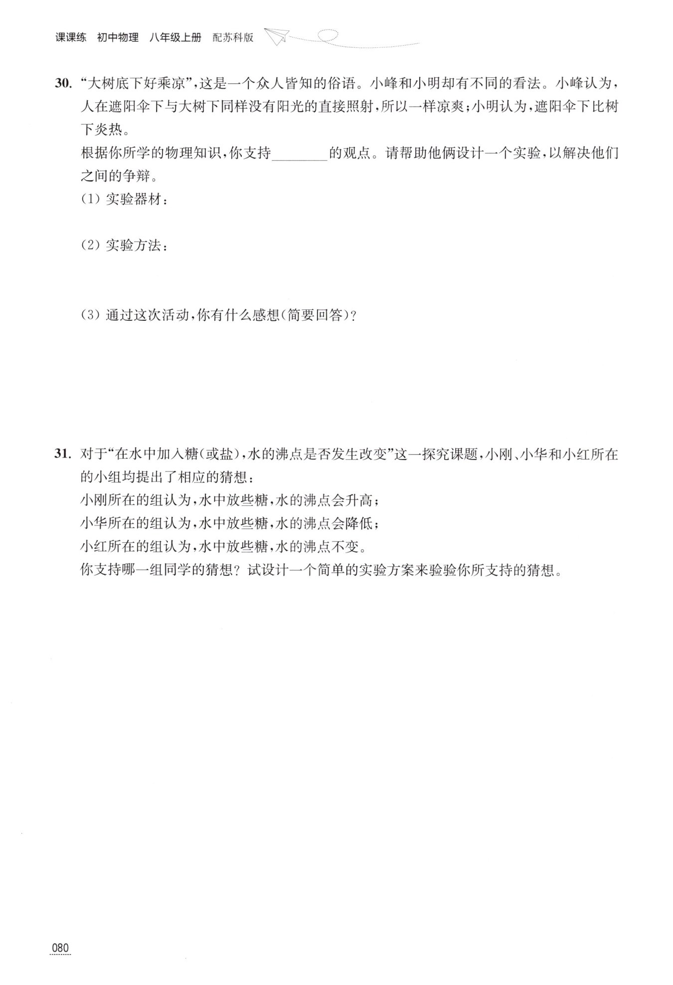 我支持小剛小組的猜想。用兩個相同的燒杯、兩支溫度計、兩個帶鐵圈和鐵桿的鐵架臺、兩個酒精燈、熱水若干、石棉網(wǎng)兩個、火柴,然后組裝好實驗裝置。分別向燒杯中加入一定量的熱水,一杯中只有水,另一杯中加入糖,然后用酒精燈給燒杯加熱,并用溫度計測量兩個燒杯中水和糖水的溫度,當加熱至沸騰時,分別讀出溫度計的示數(shù),然后進行比較。如果糖水沸騰時溫度比水高,說明水中放些糖,水的沸點會升高;如果糖水沸騰時溫度比水低,水中放些糖,水的沸點會降低;如果糖水沸騰時溫度與水沸騰時溫度相等,說明水中放些糖,水的沸點不變。