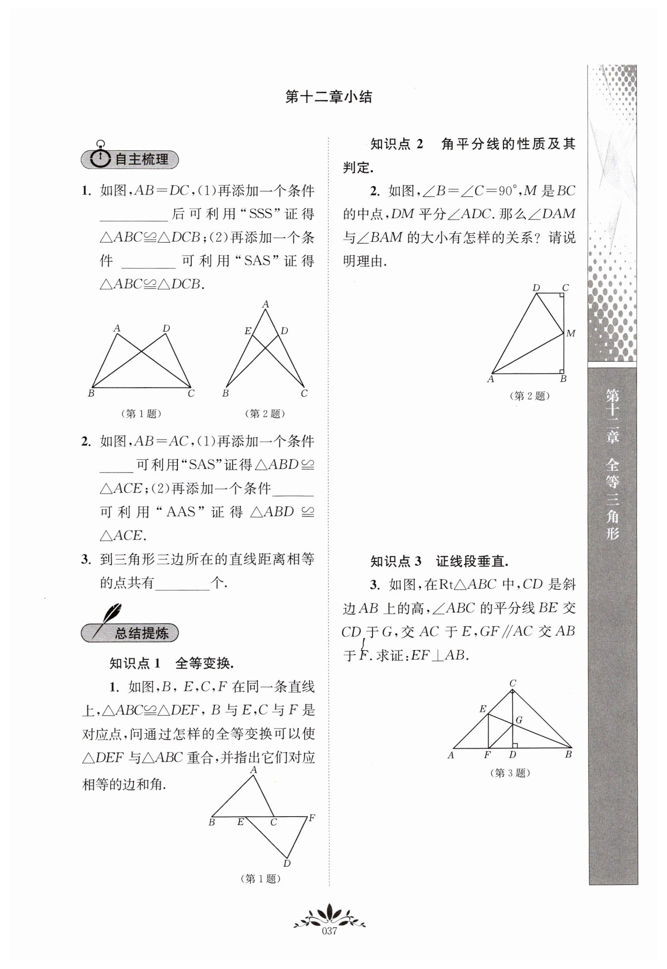 $解:把△DEF沿EF翻折180°,再把翻折后的圖形$ $沿CB方向平移,使點E與點B重合,$ $則△DEF就能與△ABC重合;$ $AB=DE,BC=EF,AC=DF;$ $∠A=∠D,∠B=∠DEF,∠ACB=∠DFE.$