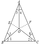 $證明:如圖,對相關(guān)角進行標注,$ $作OE⊥AB于E,OF⊥AC于F.$ $∵AO平分∠BAC, $ $∴OE=OF. $ $∵∠1=∠2, $ $∴OB=OC, $ $∴Rt△OBE≌Rt△OCF, $ $∴∠5=∠6, $ $∴∠1+∠5=∠2+∠6,即∠ABC=∠ACB, $ $∴AB=AC, $ $∴△ABC是等腰三角形. $