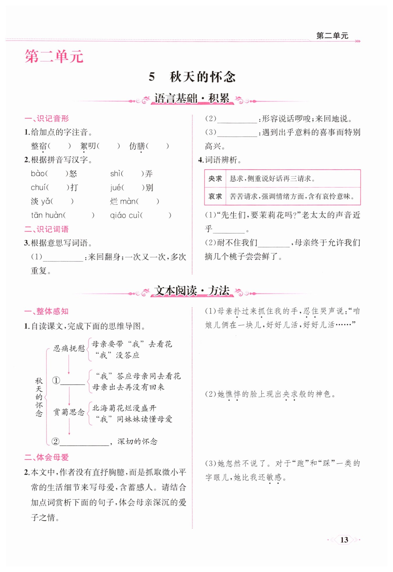 分虛弱;“央求”反映出母親既盼望“我”早日