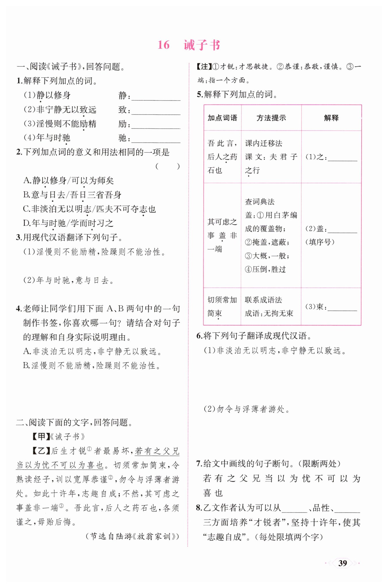 示例一:我喜歡A句。 這句話的意思是不內(nèi)心恬淡、 輕視名利,就沒有什么可以拿來使自己明確志向,不集中精神,就沒有什么可以拿來使自己達(dá)到遠(yuǎn)大目標(biāo)。 我在生活中比較愛攀比,不能將精力集中在學(xué)習(xí)上,所以我要把這句話做成書簽來提醒自己時(shí)刻保持寧靜淡泊之心,不浮躁,專注地向自己的目標(biāo)奮進(jìn)。