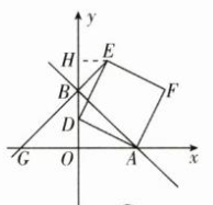 $解:②G點(diǎn)位置不變,坐標(biāo)為(-3,0)理由:$ $過(guò)點(diǎn)E作EH⊥y軸于H$ $則∠EHD=∠DOA=90°$ $∵四邊形ADEF是正方形.$ $∴AD=DE,∠ADE=90°,∴∠ADO+∠HDE=90°$ $又∵∠ADO+∠DAO=90°$ $∴∠HDE=∠OAD,∴△HDE≌△OAD(AAS)$ $∴HE=OD,OA=DH$ $∵OA=OB=3$ $∴DH=OB,∴DH-BD=BO-BD,即BH=OD$ $又HE=OD,∴BH=HE$ $∴△BHE是等腰直角三角形$ $∴∠HBE=45°,∴∠OBG=45°$ $∴△BOG為等腰直角三角形$ $∴OG=OB=3,∴G(-3,0) $