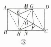 $解:如圖③,連接AH、CG、GH$ $AC與GH交于點O,M為AD邊的中點$ $N為BC邊的中點$ $∵四邊形EGFH為菱形,∴GH⊥EF$ $OG=OH,OE=OF$ $∴OA=OC,AG=AH$ $∴四邊形AGCH為菱形,∴AG=CG$ $設(shè)AG=CG=x,則DG=8-x$ $由勾股定理可得CD^{2}+DG^{2}=CG^{2}$ $解得x=\frac{25}{4}$ $∴MG=AG-AM=\frac{25}{4}-4=\frac{9}{4}$ $即t=\frac{9}{4}$ $∴當四邊形EGFH為菱形時,t=\frac{9}{4} $
