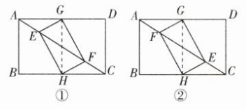 $解:連接GH,由(1)得AG=BH,AG//BH,∠B=90°$ $∴四邊形ABHG 是矩形$ $∴GH=AB=6,則AC= \sqrt{AB^{2}+BC^{2}}=10$ $如圖①,當四邊形EGFH是矩形時$ $則EF=GH=6$ $∵AE=CF=t,∴EF=10-2t=6,∴t=2$