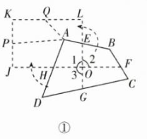 解:②如圖①,由題意得,E、F、G、H 是AB、BC、CD、DA的中點(diǎn) 操作為將四邊形EBFO繞點(diǎn)E旋轉(zhuǎn)180°得到四邊形EAQL 將四邊形OHDG繞點(diǎn)H旋轉(zhuǎn)180°得到四邊形JHAP 將四邊形OGCF放在左上方空出部分 則AQ=BF=CF,AP=DG=CG,∠BFO=∠AQL ∵∠DAB+∠B+∠C+∠D=360° ∠QAE=∠B,∠PAH=∠D ∠DAB+∠QAE+∠PAH+∠PAQ=360° ∴∠PAQ=∠C ∵∠BF0+∠CFO=180°,∴∠AQL+∠AQK=180° ∴K、Q、L三點(diǎn)共線 同理K、P、J三點(diǎn)共線 由操作得,∠2=∠L,∠3=∠J ∵∠1+∠2=180°,∠1+∠3=180° ∴∠1+∠L=180°,∠1+∠J=180° ∴OJ//KL,OL//KJ ∴四邊形OJKL為平行四邊形