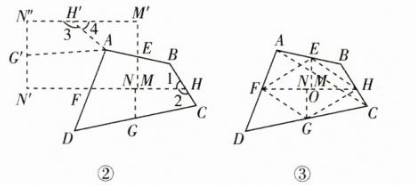 $\ 如圖③,連接AC,EF,FG,GH,EH$ $∵E、H分別為BA、BC中點(diǎn)$ $∴EH//AC,EH=\frac{1}{2}AC$ $同理FG//AC,FG=\frac{1}{2}AC$ $∴FG//EH,FG=EH,∴∠EHM=∠GFN$ $∵∠EMF=∠CNH=90°,∴△EHM≌△GFN$ $∴EM=GN,MH=NF,∴FM=NH$ $由操作得AH'=BH,而BH=CH,∴AH'=CH$ $同理,AG'=CG$ $∵∠BAD+∠D+∠C+∠B=360°$ $∠D=∠G'AF,∠B=∠H'AE$ $∠BAD+∠HAE+∠G'AF+∠H'AG'=360°$ $∴∠HAG'=∠C$ $∵四邊形MM'N"N為矩形$ $∴ N'N''=MM,N"M'=N'M$ $∴N'F+FM=H'M'+H'N''$ $∴MF+NF=MF+MH=M'H'+N''H'$ $∴NH=N"H',同理NG=N"G'$ $∴四邊形NGCH能放置左上方空出部分$ $∴按照以上操作可以拼成一個矩形 $