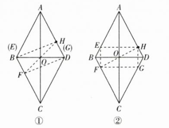 $\ ∵AO⊥BD,BH⊥HG,AO=10$ $BD=OD×2=10,AD=5\sqrt {5}$ $∴S_{△ABD}=\frac{BD×AO}{2}=\frac{AD×BH}{2},解得BH=4\sqrt{5}$ $∴由勾股定理可得AH=\sqrt {AB^{2}-BH^{2}}=3\sqrt {5}$ $∵點(diǎn)H與點(diǎn)D重合時不能形成矩形$ $∴AH≠5\sqrt {5}$ $∴當(dāng)3\sqrt {5}≤AH<5\sqrt {5}時$ $滿足四邊形EFGH為矩形$ $當(dāng)AH=4\sqrt {5}時,AE=4\sqrt {5}$ $如圖②所示$ $\ ∴此時四邊形EFGH同時滿足①②$ $∴不能形成兩個矩形,不滿足題意$ $綜上可得,當(dāng)AH滿足3\sqrt {5}≤AH<5\sqrt {5}且AH≠4\sqrt {5}時$ $可作出兩個不同矩形EFGH. $