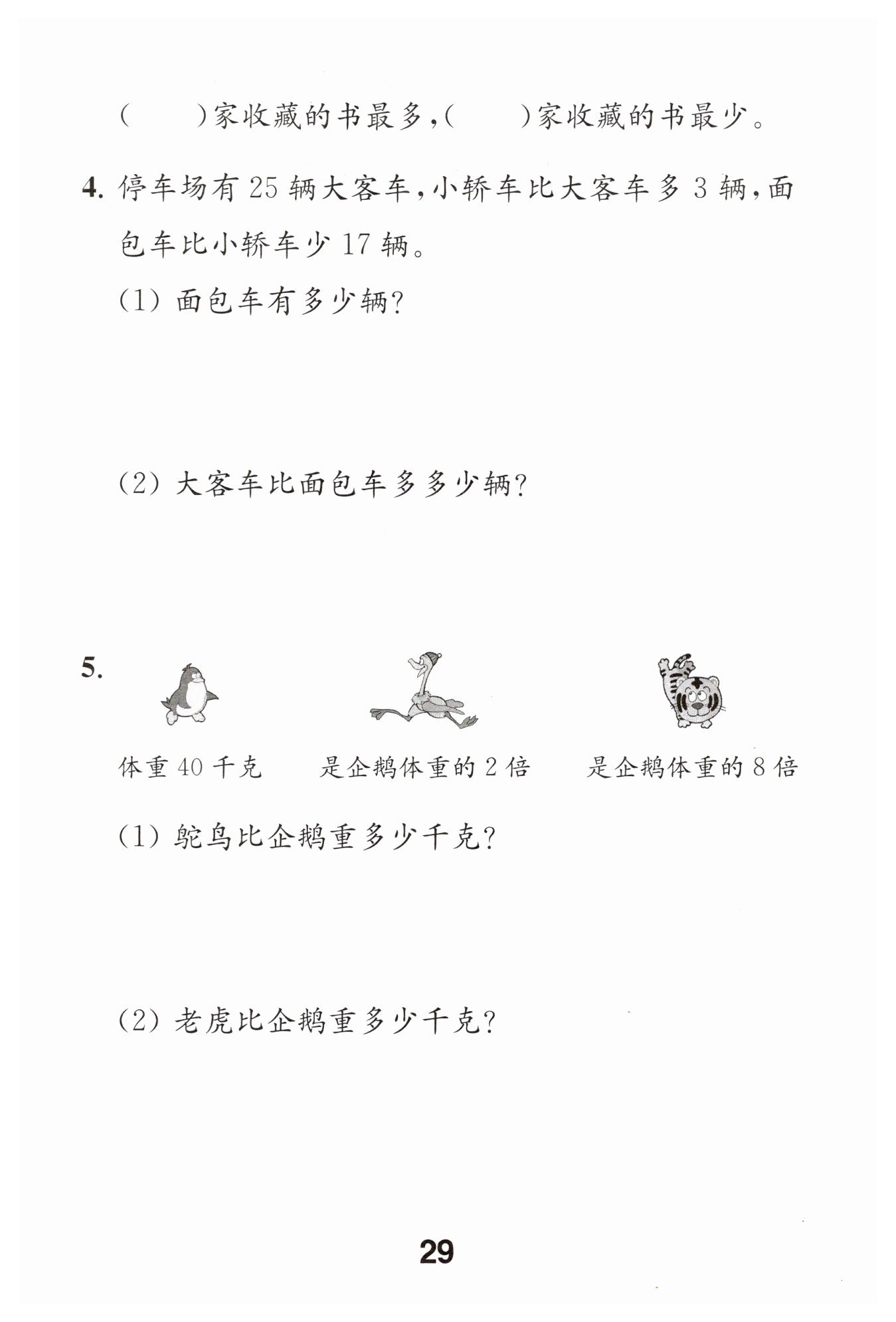 答:老虎比企鵝重280千克。
