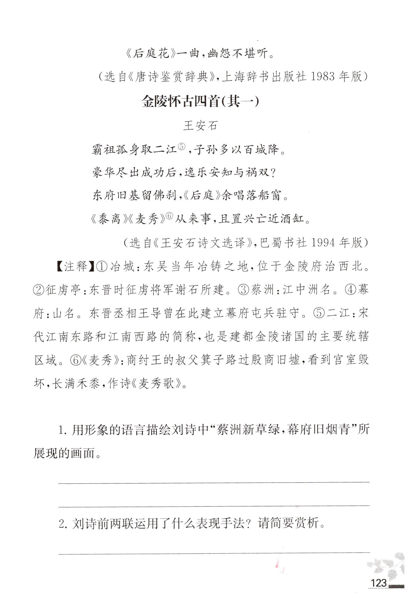 ①對比。用吳國的雄圖霸業(yè)以及東晉王謝貴族之家曾在這里餞行送別的熱鬧場面和眼前的一片荒涼的景象形成對比。②情景交融。山川風(fēng)物在變幻的歷史長河中沒有任何的變化,詩人看到的仍是:春草年年綠,舊煙歲歲青。并為下文的感慨做鋪墊。
