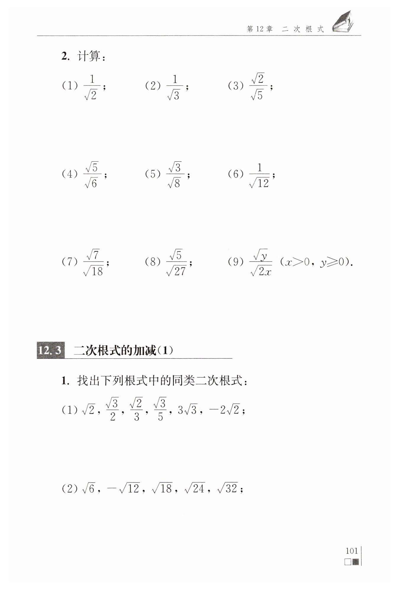 $?解: {\sqrt {2}},{\frac {\sqrt {2}} {3}},-2{\sqrt {2}}是同類二次根式,{\frac {\sqrt {3}} {2}},{\frac {\sqrt {3}} {5}},3{\sqrt {3}}是同類二次根式$