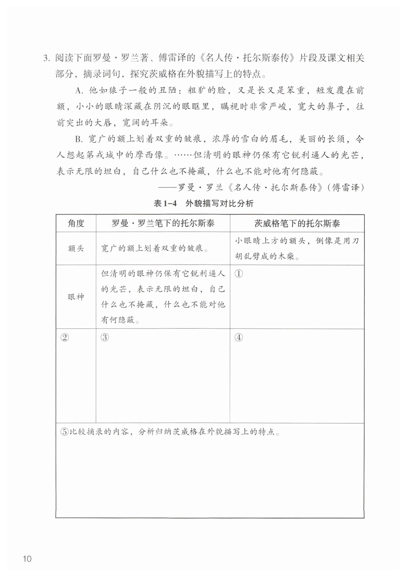 細地描述托爾斯泰目光的犀利;如寫胡須,《名人傳》只用“美麗