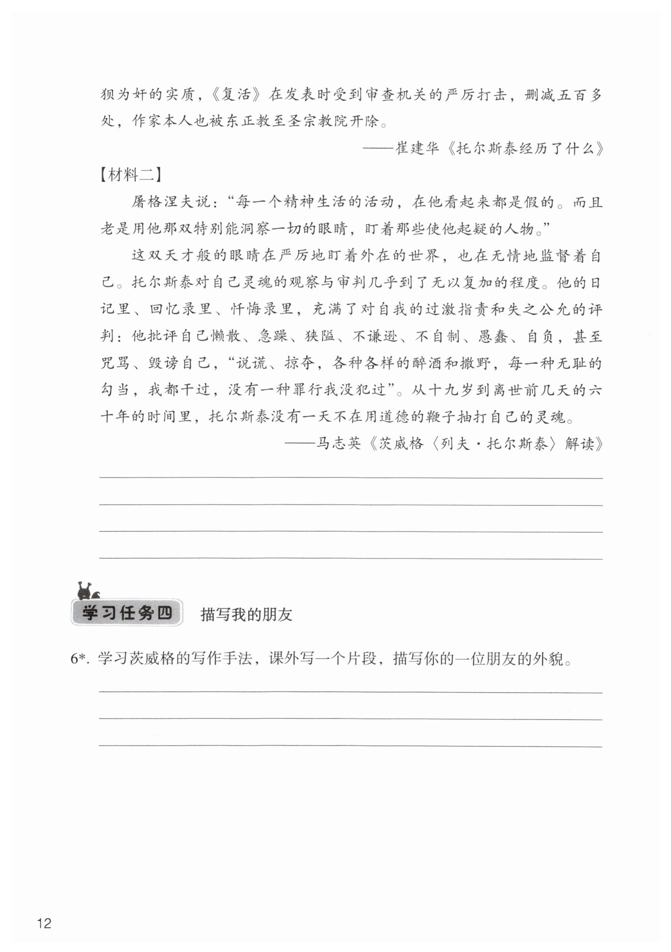 [示例]首先,托爾斯泰目光犀利,敏銳地審視自己的不足,自我剖析、自我批判,因此痛苦;其次,他關(guān)愛農(nóng)民,具有悲憫情懷,而他身為貴族,又厭倦貴族生活,厭惡自己身上的貴族陋習(xí),因此他的精神世界是矛盾的、痛苦的;最后,托爾斯泰能看透事物本質(zhì),能洞察社3會(huì)真相,而看到黑暗現(xiàn)實(shí)卻無力改變,這是最大的痛苦。