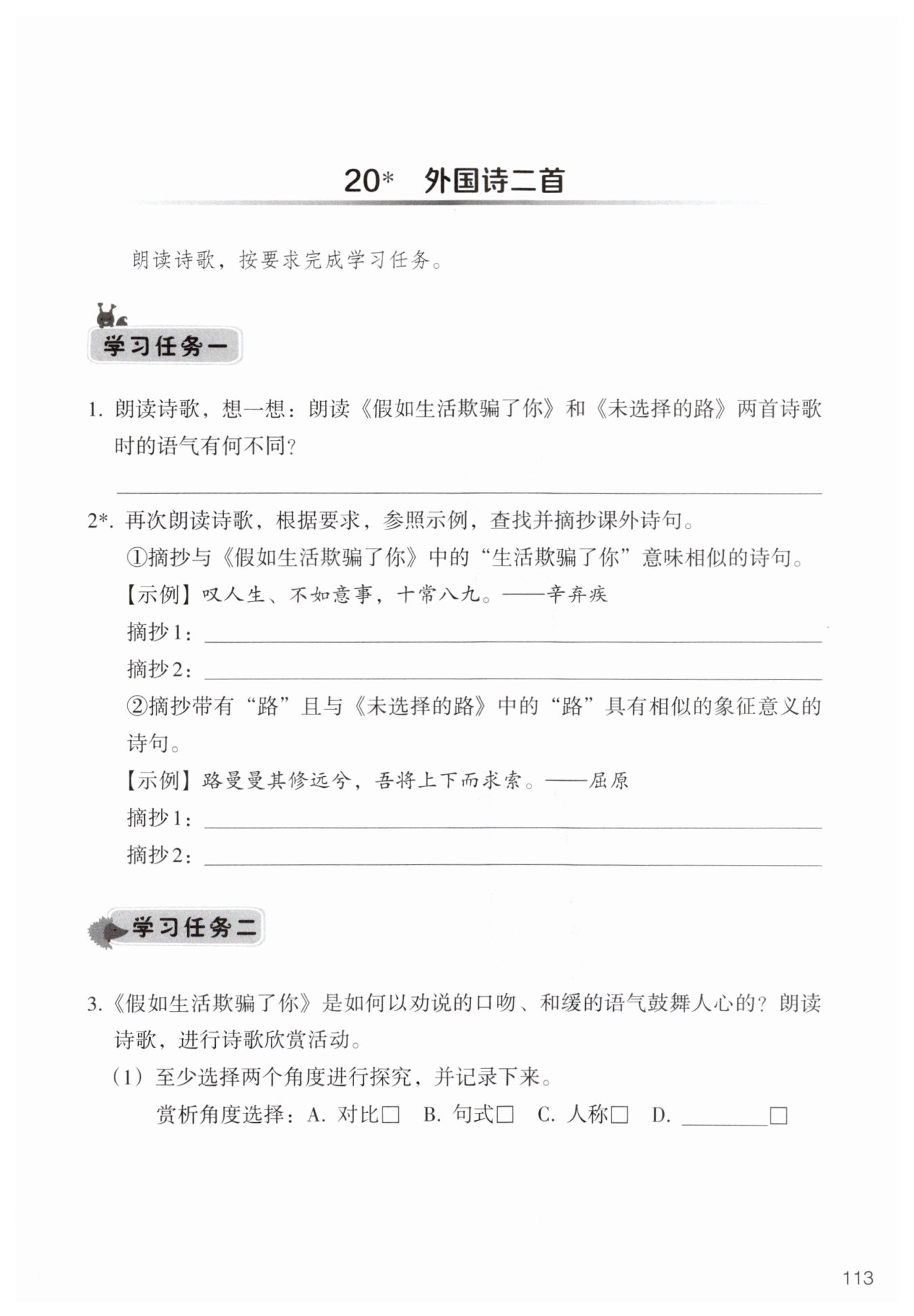 《假如生活欺騙了你》要讀出輕柔、安慰的語(yǔ)氣;《未選擇的路》要讀出舒緩、沉思的語(yǔ)氣。