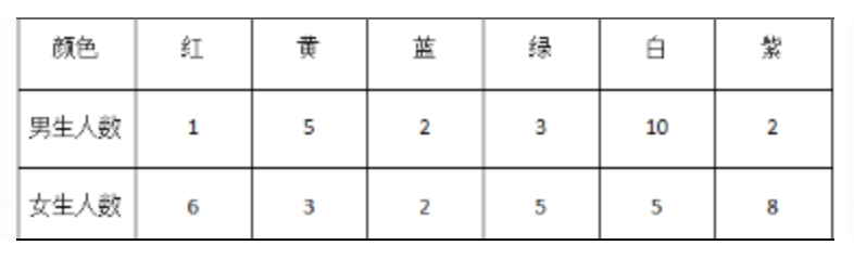 答:從調(diào)查情況來看,男生喜歡白色的人數(shù)最多,女生喜歡紫色的人數(shù)最多。