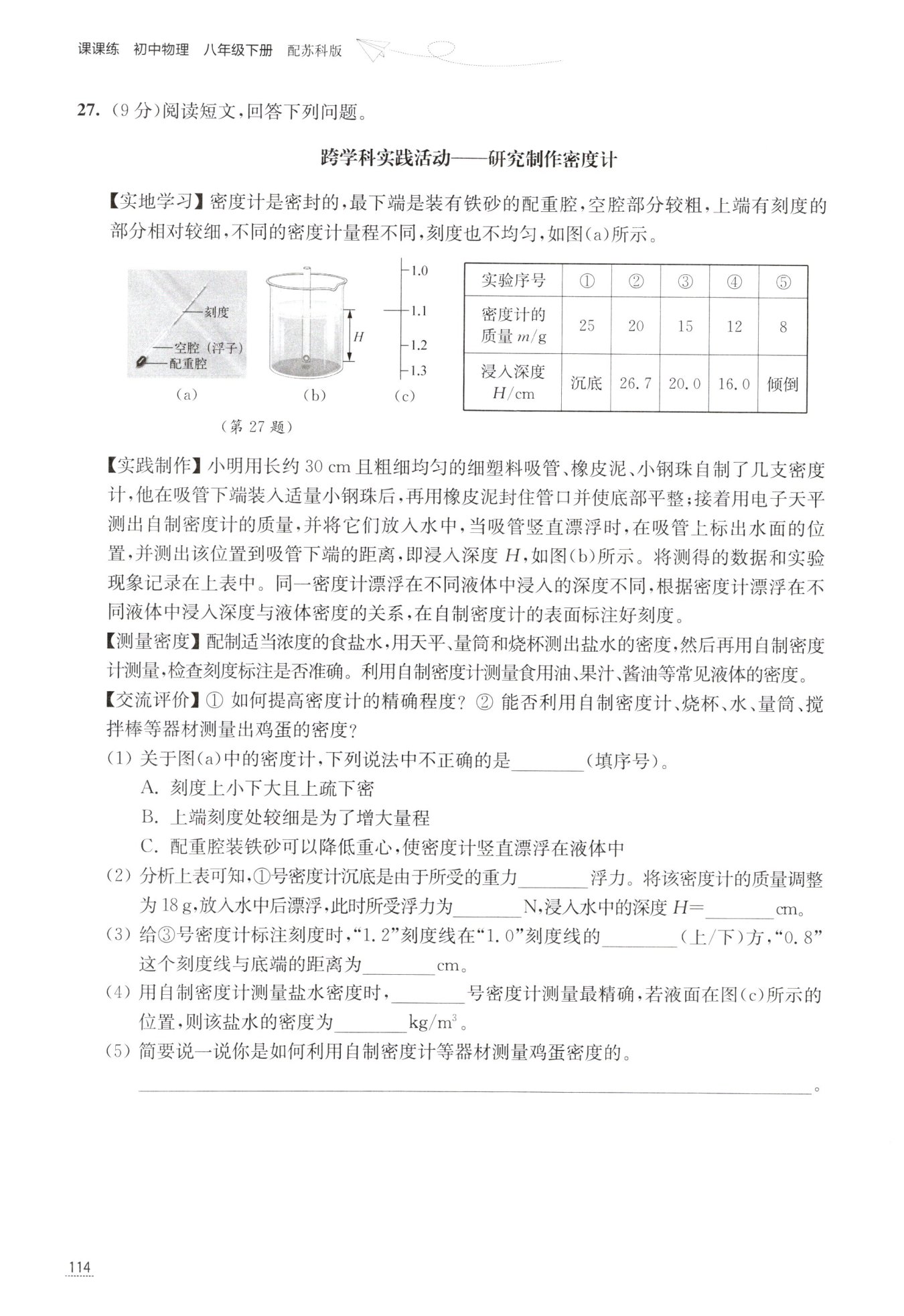 中。此時(shí),用自制密度計(jì)測(cè)量鹽水的密度,記為?$\rho。$?由于雞蛋懸浮在鹽水中,所
