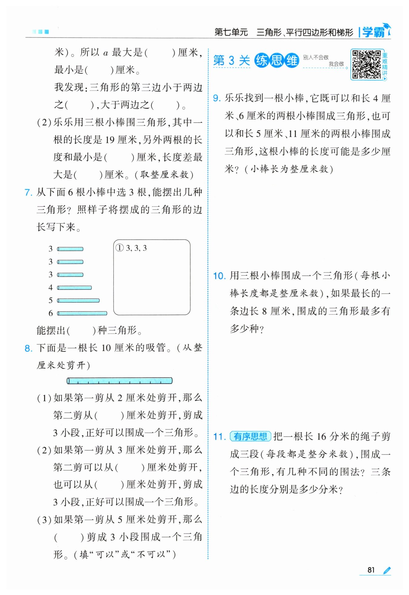 答:這根小棒的長度可能是7厘米或8厘米或9厘米。