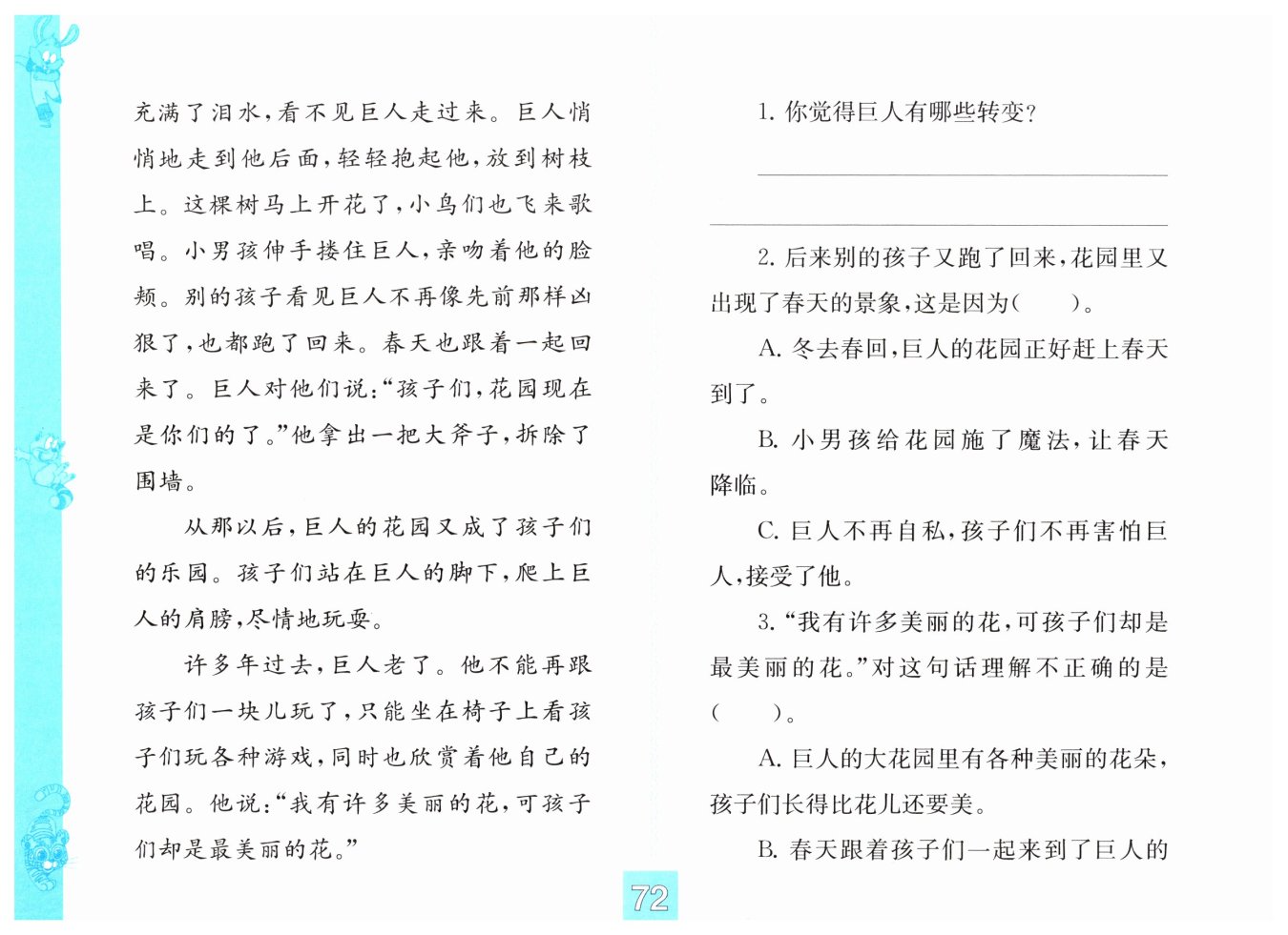 里玩。他變得溫柔、和善了,不再自私,而是樂于與孩子們分享快樂。