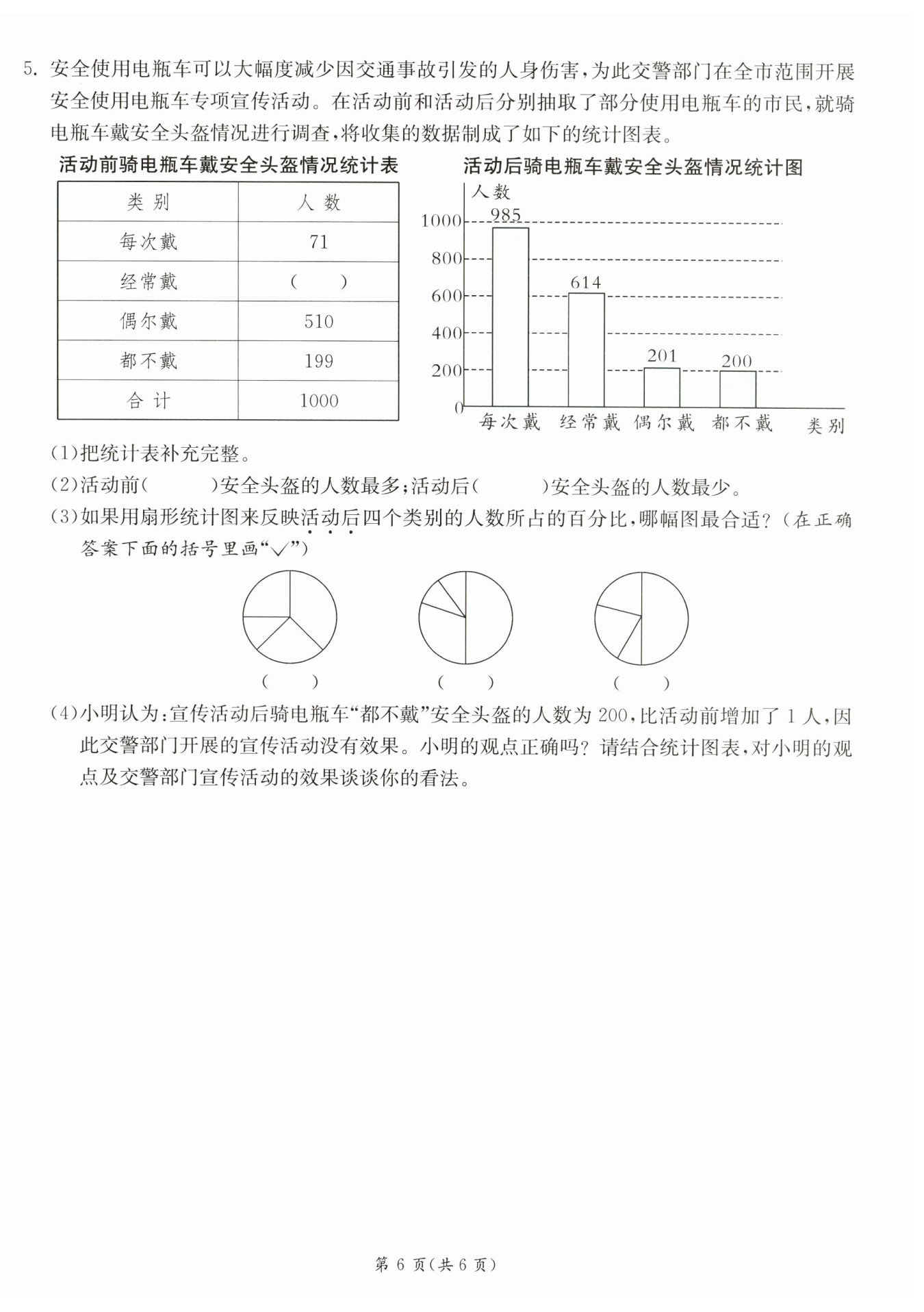 答:小明的觀點(diǎn)不正確,活動(dòng)前與活動(dòng)后調(diào)查的總?cè)藬?shù)不同,宣傳活動(dòng)后全市騎電瓶車“都不戴”安全頭盔的人數(shù)百分比下降了,“每次戴”的人數(shù)明顯大幅增加,說明交警部門開展的宣傳活動(dòng)有效果,已經(jīng)起作用了。