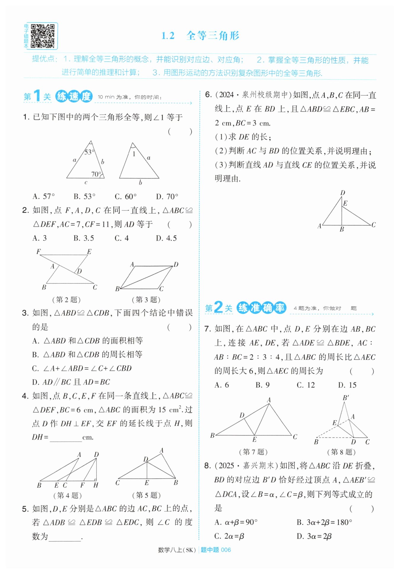 (2)$AC\perp BD。$理由:因?yàn)?\triangle ABD\cong\triangle EBC,$所以$\angle ABD=\angle EBC。$又點(diǎn)$A,$$B,$$C$在一條直線上,所以$\angle EBC = 90^{\circ},$所以$AC\perp BD。$