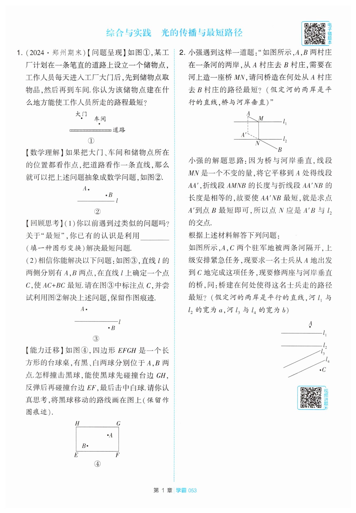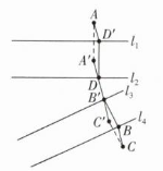 解:對(duì)于從$A$地到$C$地建兩座橋使路徑最短: ①作$AA'\perp l_1,$且$AA' = a;$ ②作$CC'\perp l_4,$且$CC' = b;$ ③連接$A'C'$與$l_2,$$l_3$分別交于點(diǎn)$D,$$B';$ ④過(guò)點(diǎn)$D$作$DD'\perp l_1$交$l_1$于點(diǎn)$D',$過(guò)點(diǎn)$B'$作$BB'\perp l_4,$交$l_4$于點(diǎn)$B;$ ⑤連接$AD',$$CB。$則$BB'$和$DD'$即為所求。