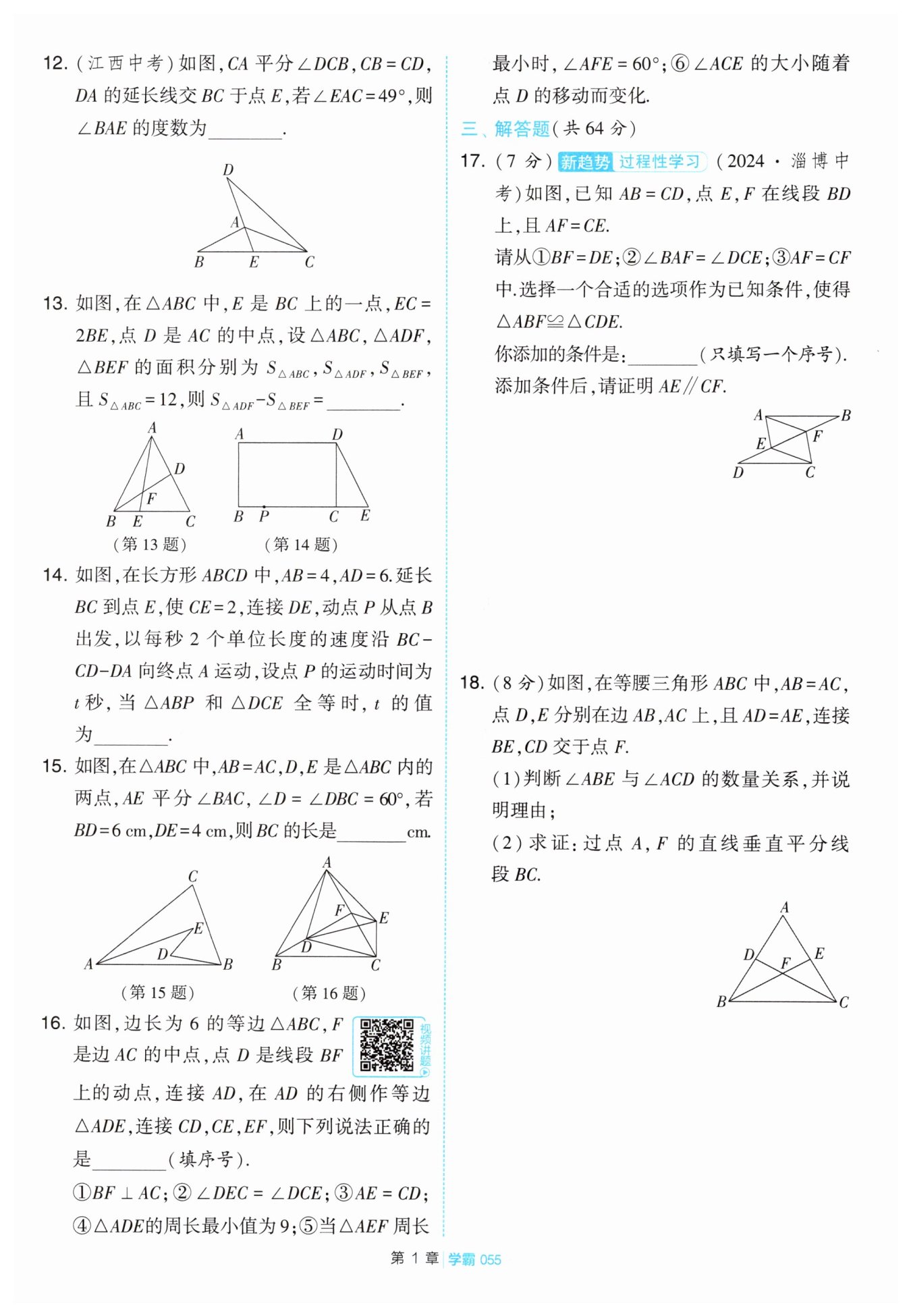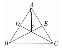 (1)可知$\angle ABE = \angle ACD,$$\therefore \angle FBC = \angle FCB,$$\therefore FB = FC。$$\because AB = AC,$$\therefore$點(diǎn)$A,$$F$均在線段$BC$的垂直平分線上,即過點(diǎn)$A,$$F$的直線垂直平分線段$BC。$