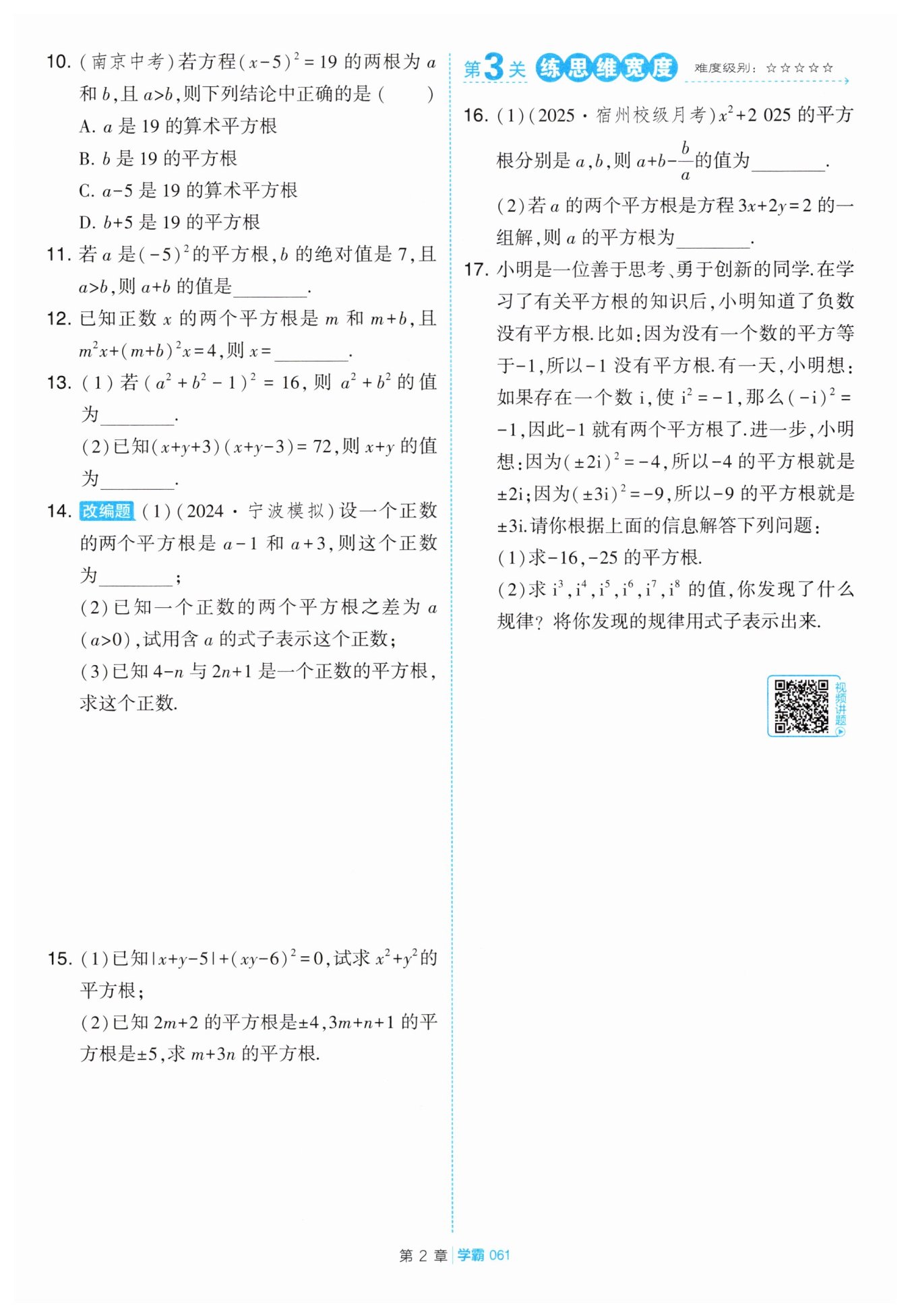 ②當(dāng)這兩個(gè)平方根互為相反數(shù)時(shí),可得$(4 - n)+(2n + 1)=0,$