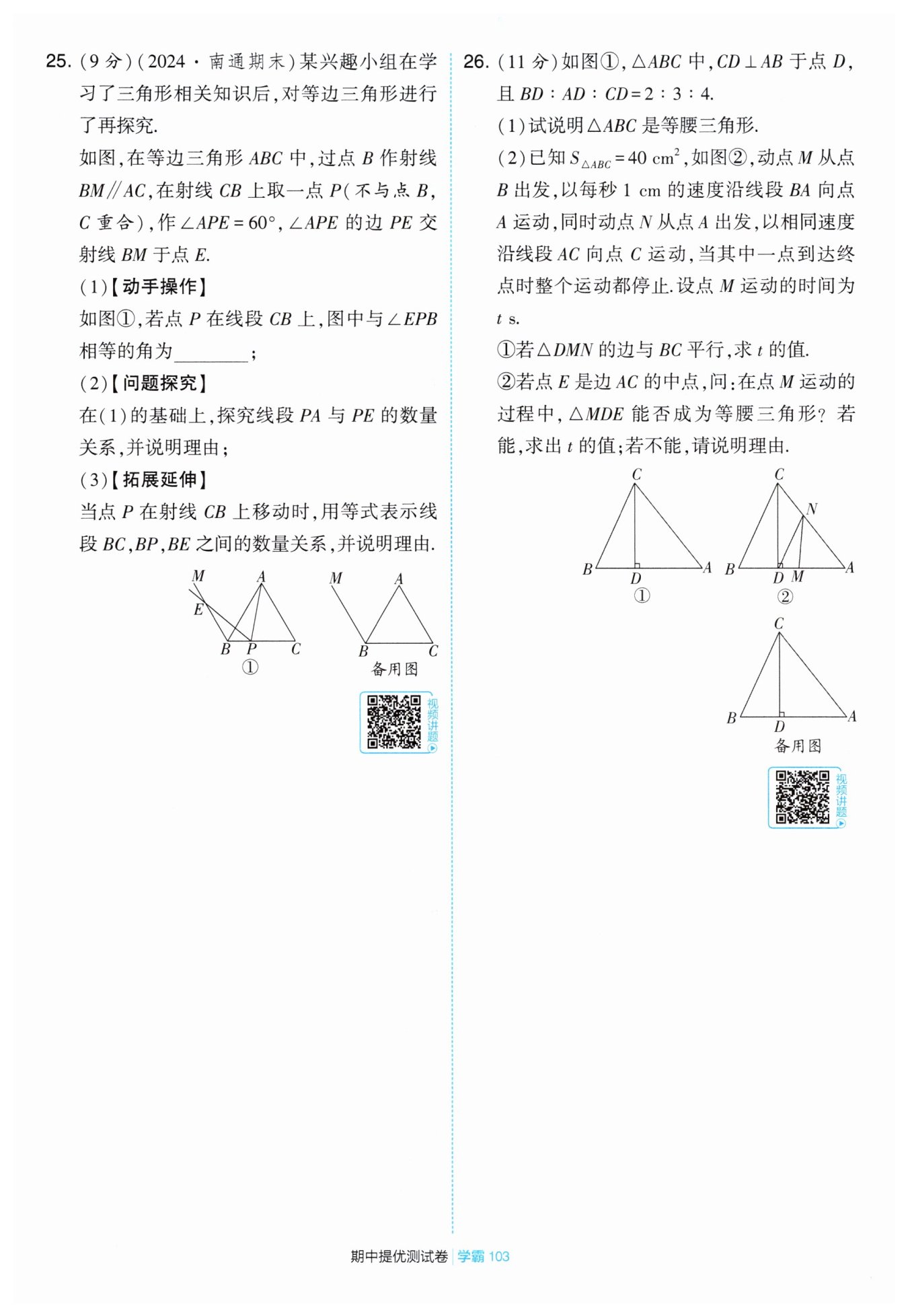 $\because BM// AC,$$\therefore\angle ACB=\angle CBH = 60^{\circ}。$又$\because BP = BH,$$\therefore\triangle BPH$是等邊三角形,$\therefore PH = BP = BH,$$\angle H = 60^{\circ}=\angle ABC=\angle APE=\angle BPH,$$\therefore\angle APB=\angle EPH,$$\therefore\triangle APB\cong\triangle EPH(ASA),$$\therefore PA = PE。$