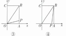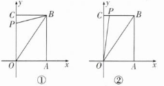 (3) 如圖①所示,$\because\triangle OBP$的面積為$10,$$\therefore\frac{1}{2}BC\cdot OP = 10,$即$\frac{1}{2}\times4\times OP = 10,$解得$OP = 5,$$\therefore$此時點$P$移動的時間是$\frac{5}{2}$秒。