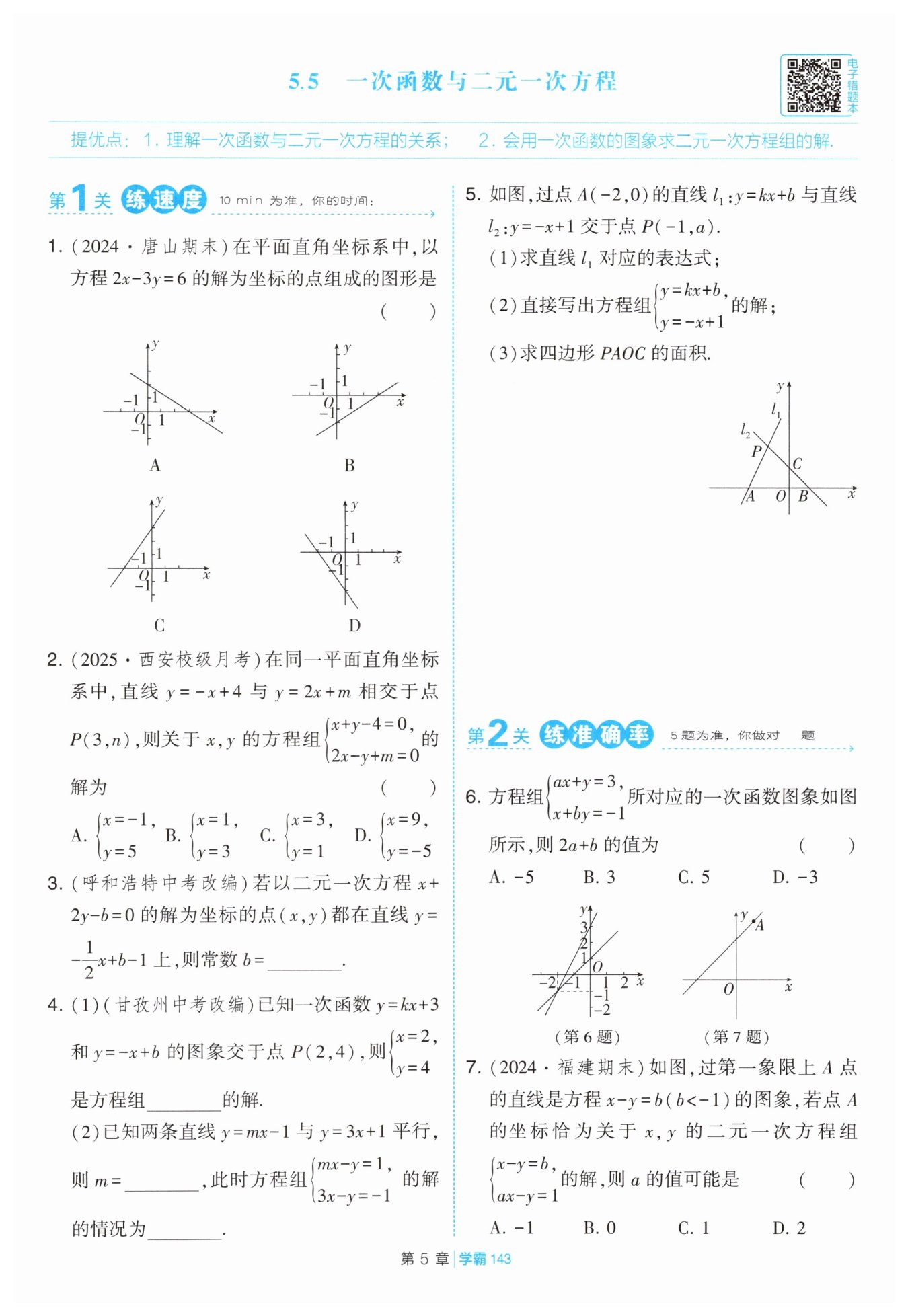 (2) 方程組$\begin{cases}y = kx + b\\y = -x + 1\end{cases}$的解為$\begin{cases}x = -1\\y = 2\end{cases}。$