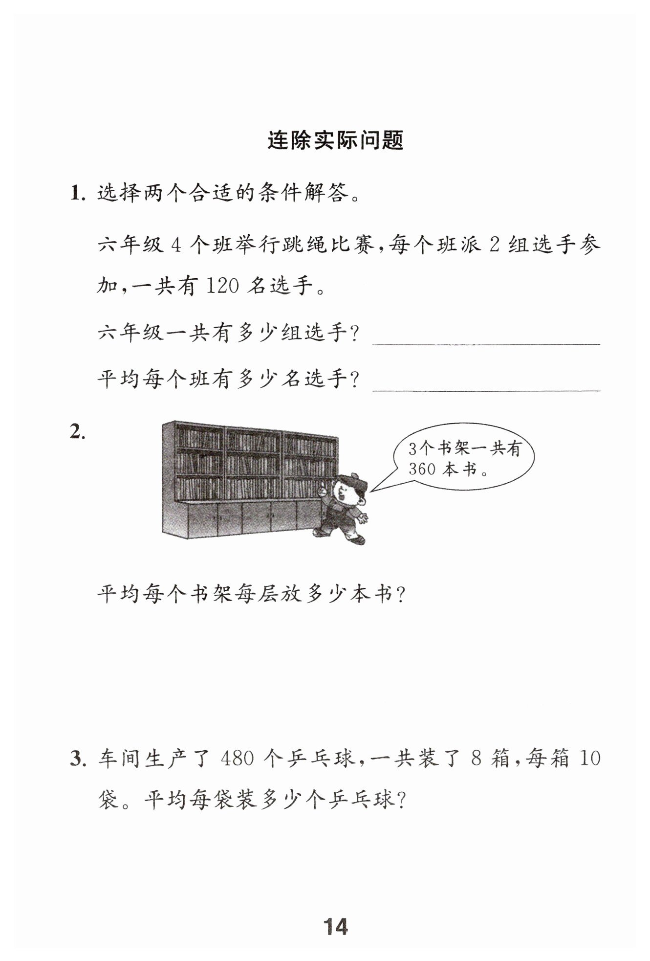 360÷3÷3=40(本) 答:平均每個(gè)書架每層放40本書。