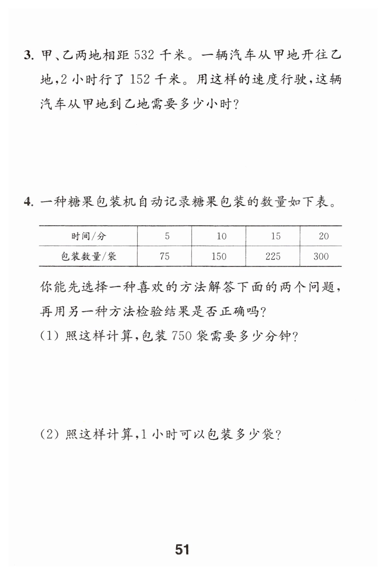 750÷(75÷5)=50(分鐘) 檢驗:75×(50÷5)=750(袋) 答:包裝750袋需要50分鐘。