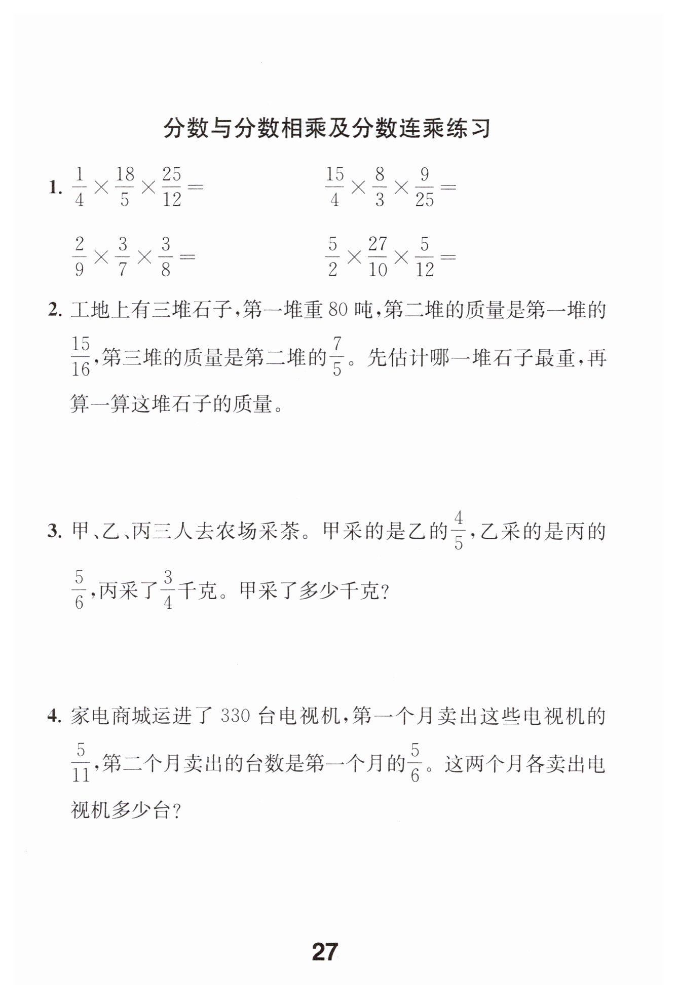 ?$\frac {3}{4}×\frac {5}{6}×\frac {4}{5}=\frac {1}{2}($?千克?$)$?