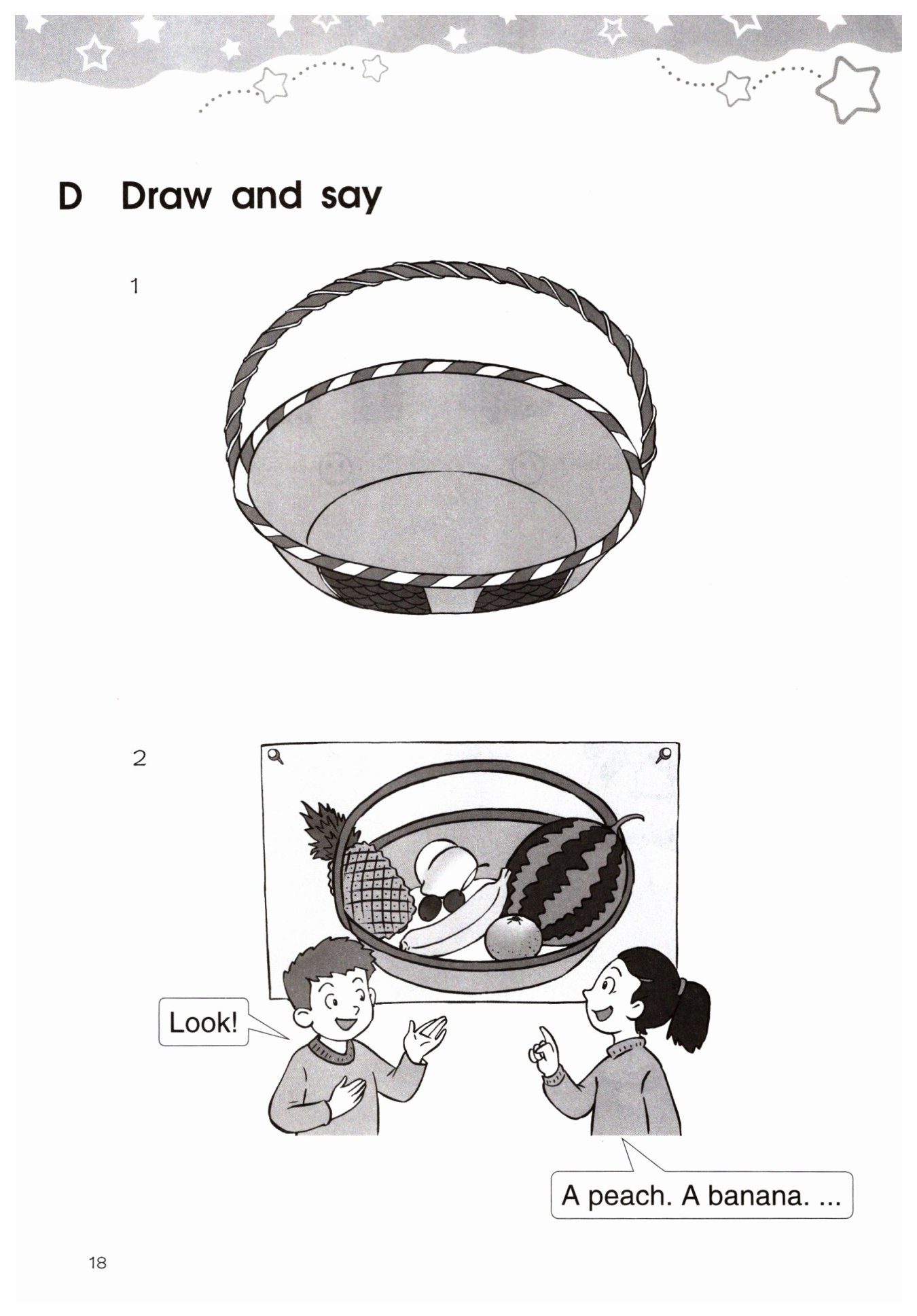 提示:請同學(xué)們在籃子里畫出自己喜歡的水果并與自己的同伴用英語說一說。