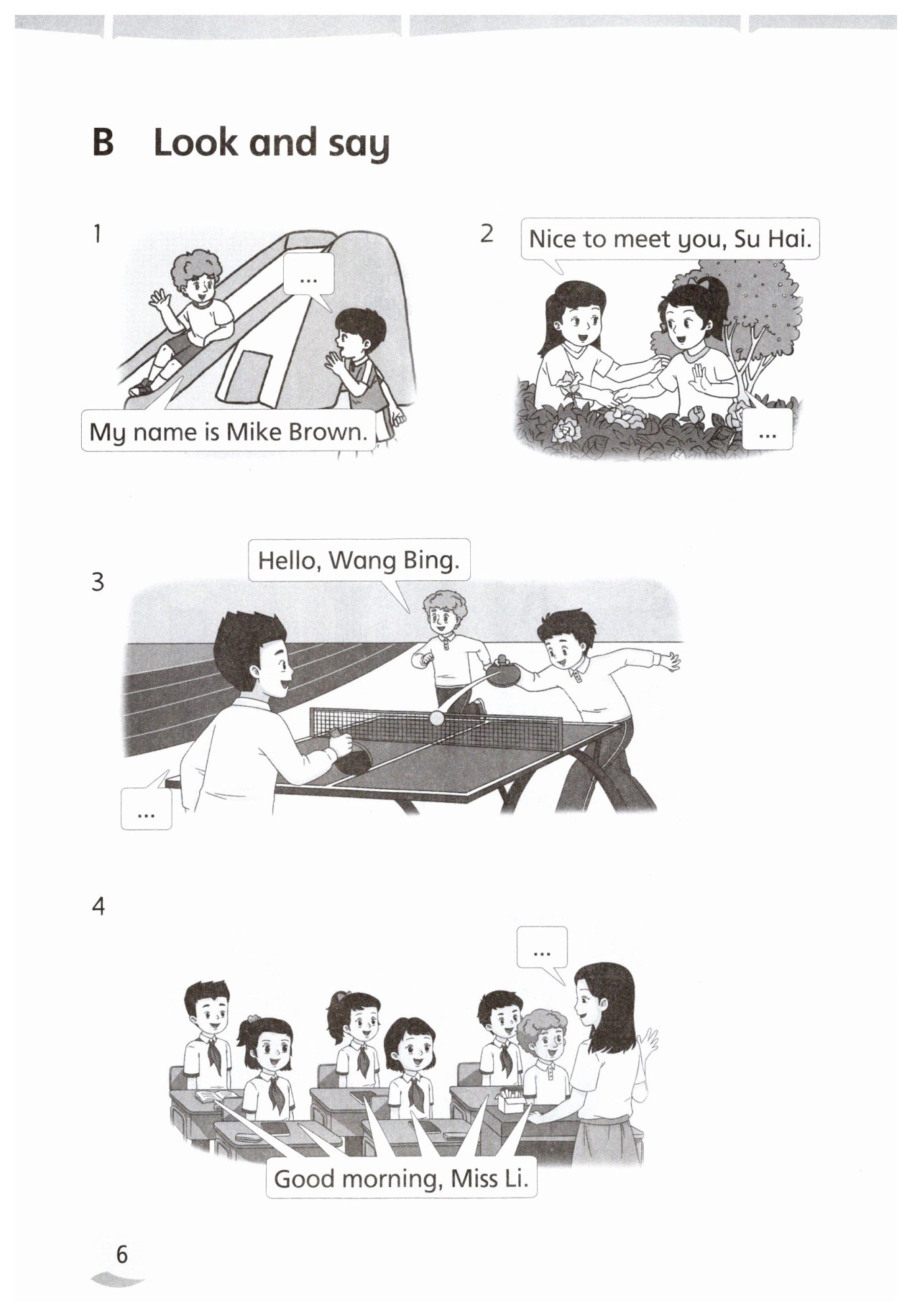 1. -Hi, what's your name?-My name is Mike Brown. 2.-Nice to meet you, Su Hai. -Nice to meet you too. 3.-Hello, Wang Bing. -Hi, Mike. 4.-Good morning, class. -Good morning, Miss Li.