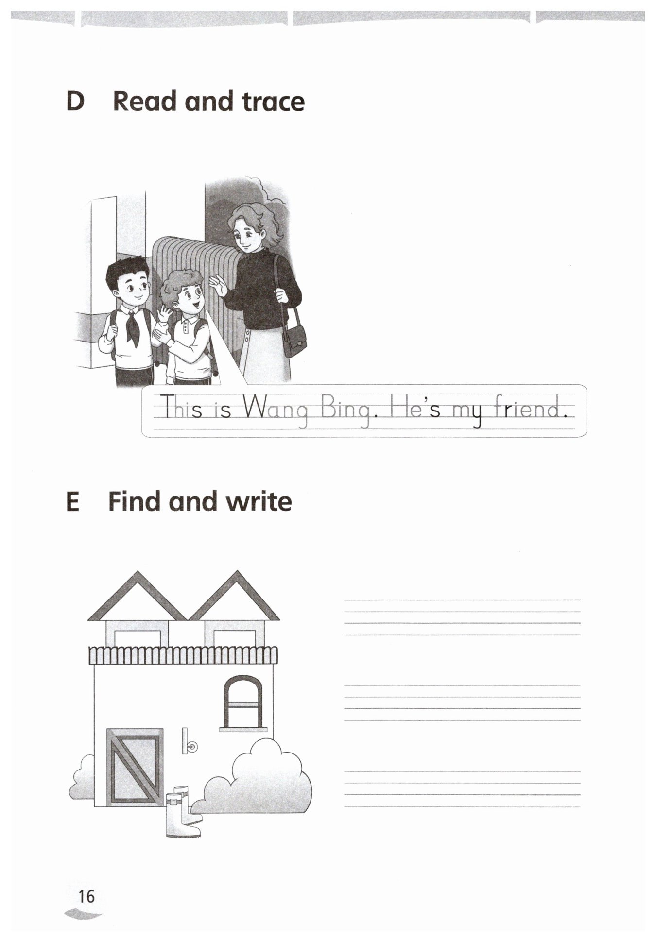 這是一道英語閱讀理解與書寫練習題,考查學生對英語句子“This is Wang Bing. He's my friend.”的認讀和書寫能力。題目要求“Read and trace”,即先讀句子,然后進行描摹書寫。對于三年級學生來說,主要需要掌握句子的正確讀音,并按照規(guī)范的書寫格式進行描摹。