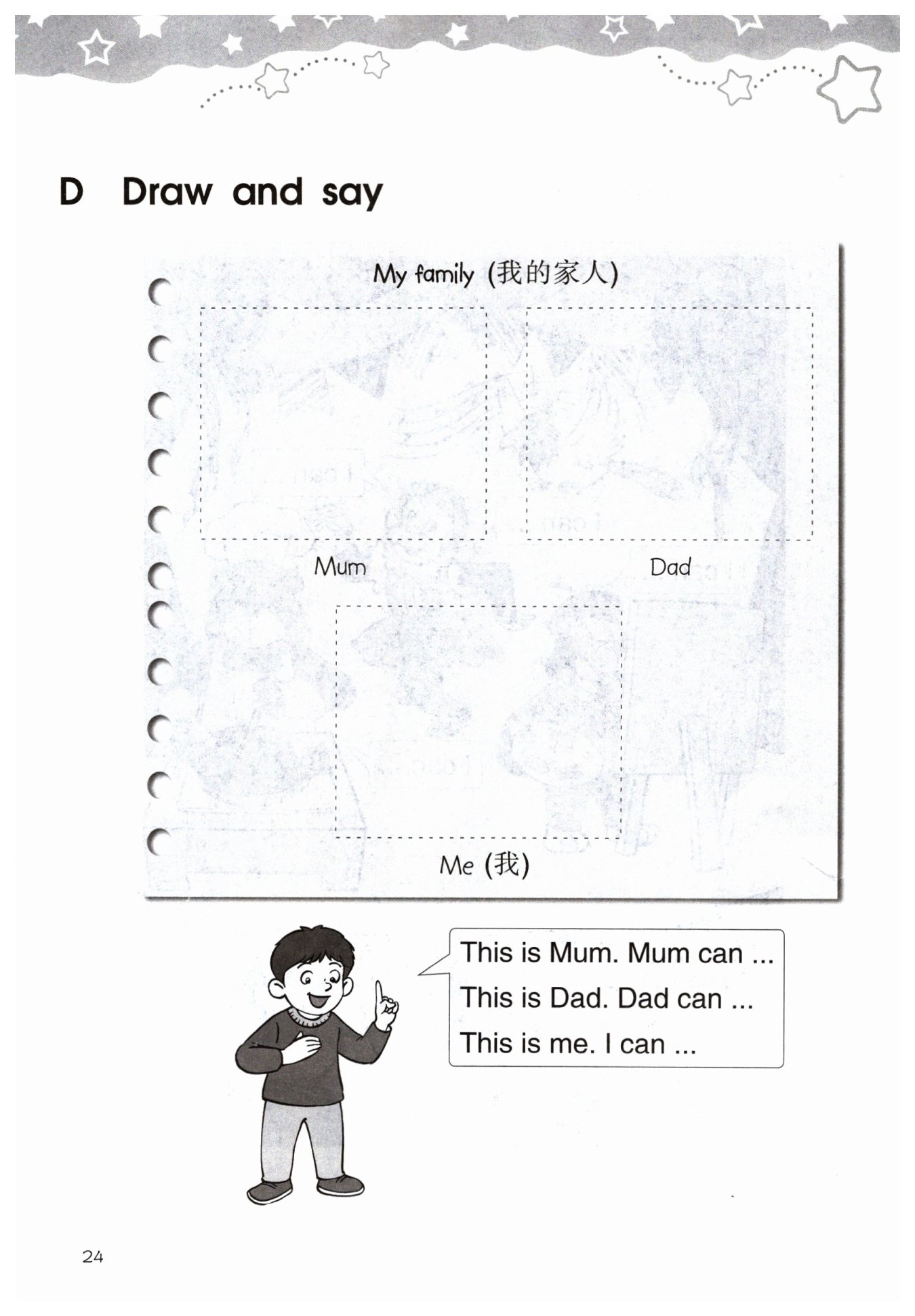 作業(yè)精靈提示:請(qǐng)同學(xué)們畫一畫自己的家人,并與同伴參照以下示例進(jìn)行交流: This is Mum. Mum can cook. This is Dad. Dad can drive. This is me. I can draw.