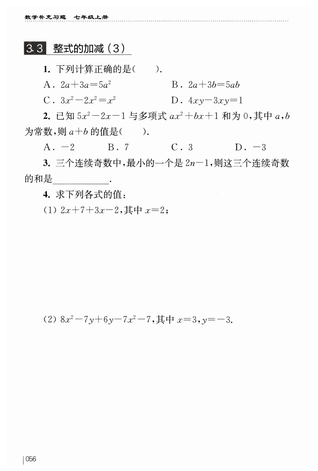 ?$ $?當(dāng)?$x = 3,$??$y = - 3$?時(shí),?$x^2-y - 7=3^2-(-3)-7=9 + 3 - 7 = 5$?