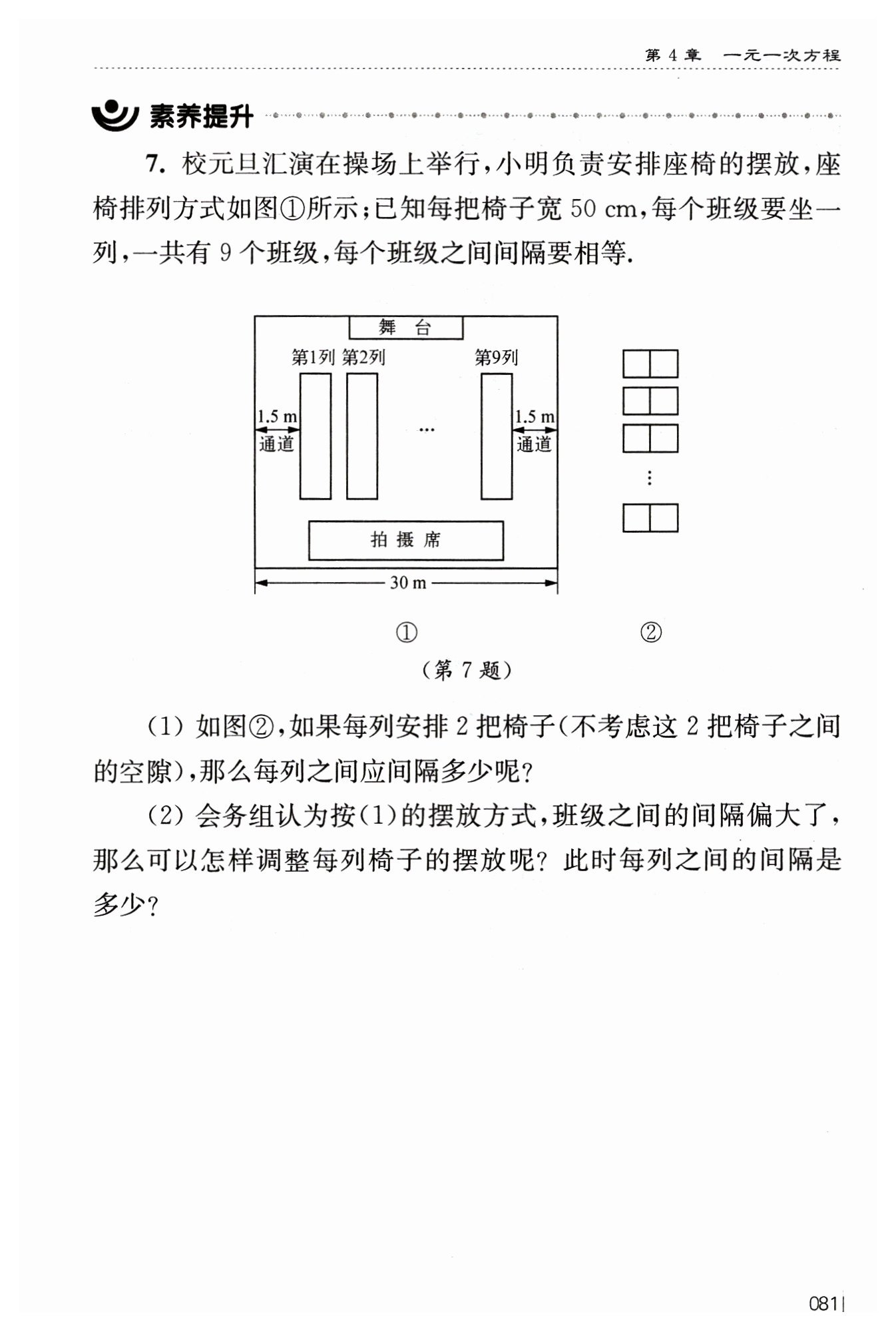 答:可以每列安排?$4$?把椅子,此時每列之間的間隔是?$1.125$?米?$.$?